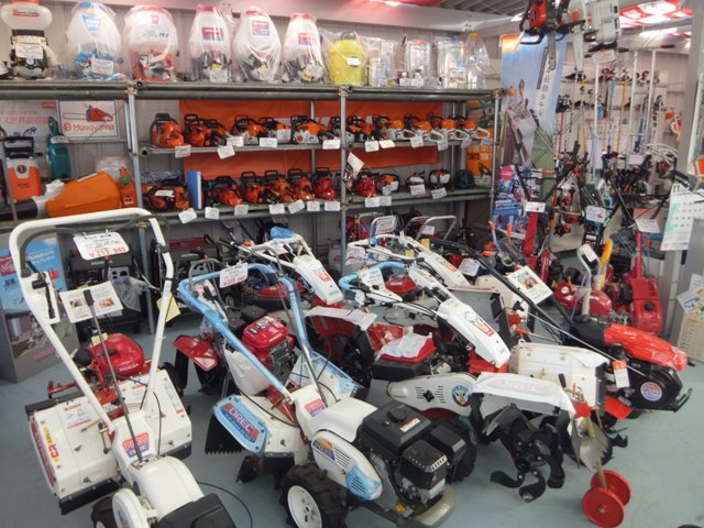 山梨県下最大級の品揃えで毎日が展示会をモットーにトラクターやコンバインなどの農作業車からチェーンソー・草刈機・農薬用噴霧器や鍬(くわ)・鎌(かま)・鋸(のきぎり)等の農具まであらゆる農機具を取り揃え展示しているので、カタログや口頭説明だけではなく、実際に見て触って比べて頂けます。中古機械は使用時間・使用頻度が少ない程度の良い機械をたくさん展示しています。